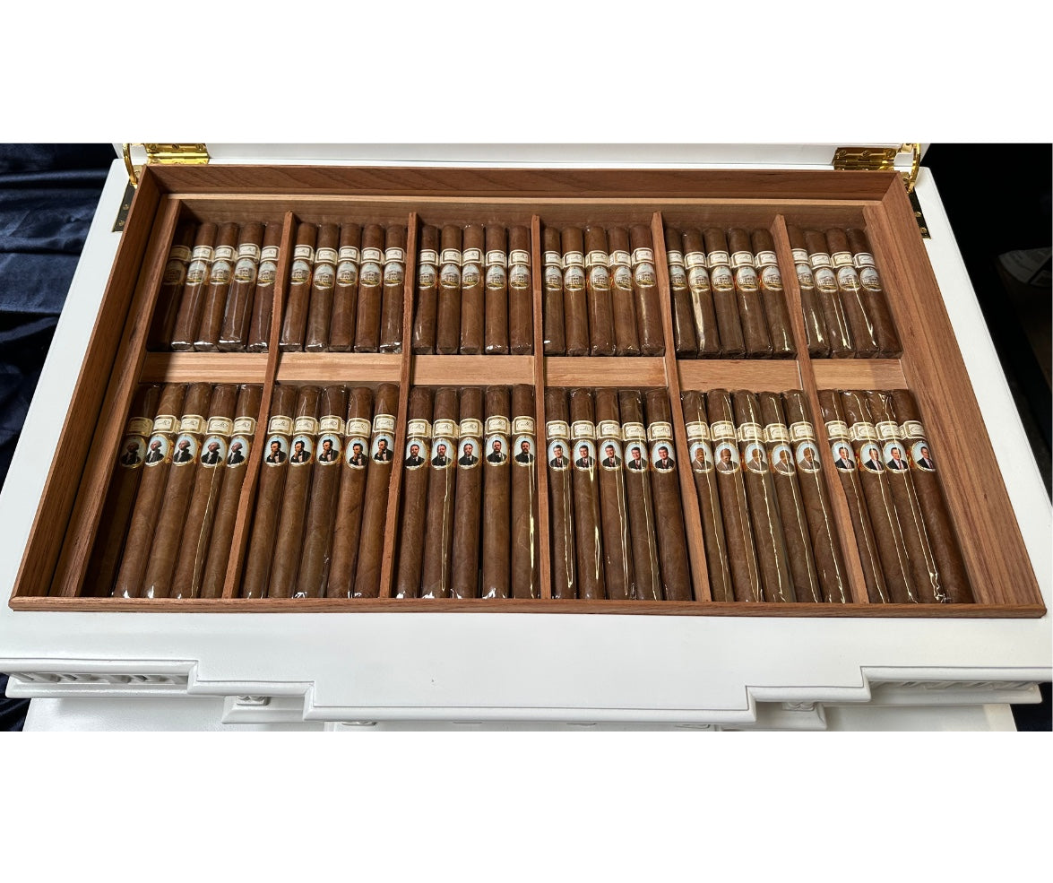 There are 400 Presidential Cigars set into two lift out Spanish cedar trays, in the lower area below the trays and within the Capitol Dome in this humidor edition.