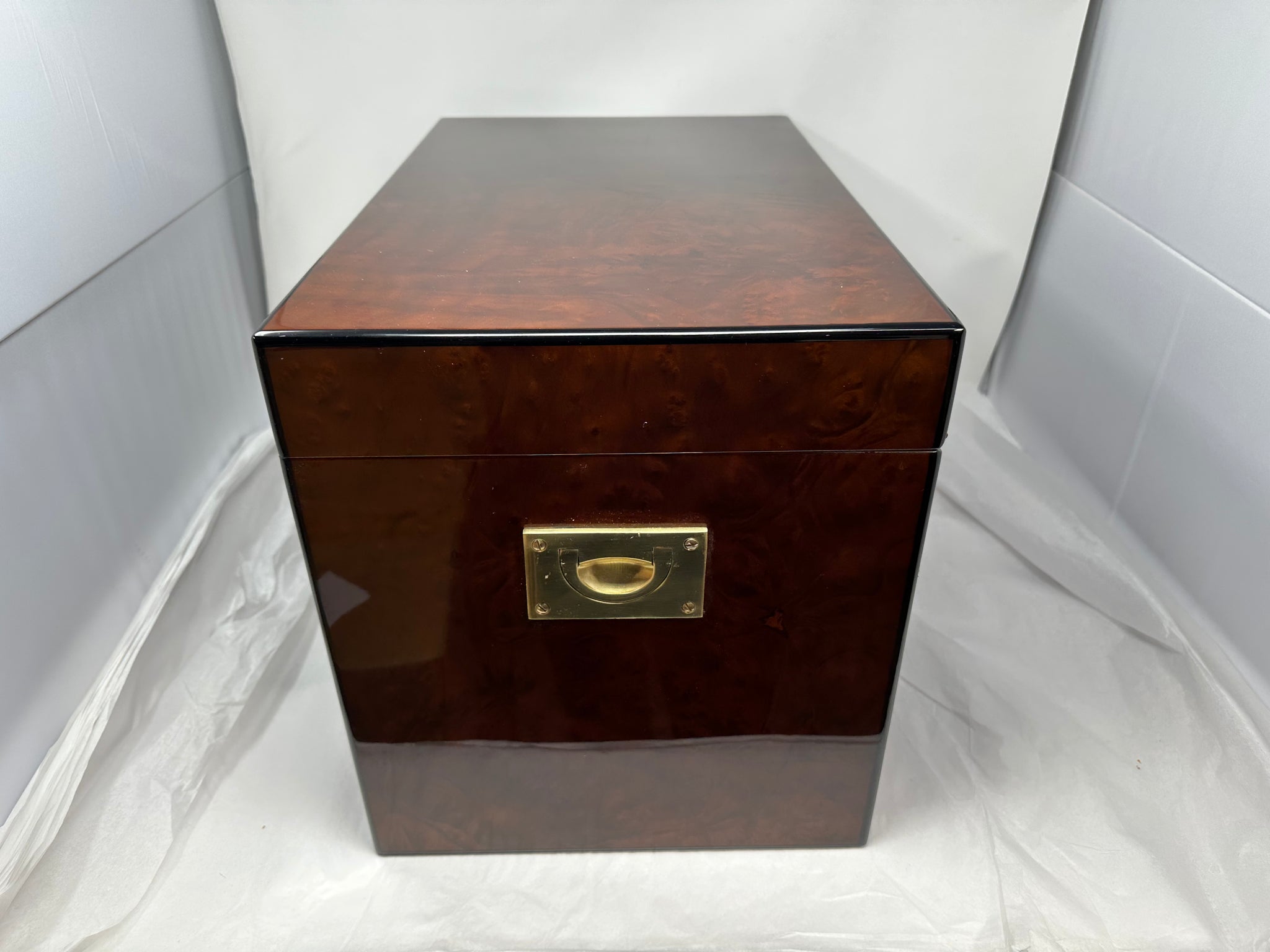 Daniel Marshall Precious Burl Humidor for 500 Cigars is from the DM Signature Collection that features 24kt Gold plated Hinges and locks, black ebony edging, Spanish Cedar interior and the trademark Daniel Marshall "1000" coat lacquer finish. Complete with 4 lift out trays and a compartment at the bottom under the trays for full boxes of cigars, gold lock, two gold Keys
